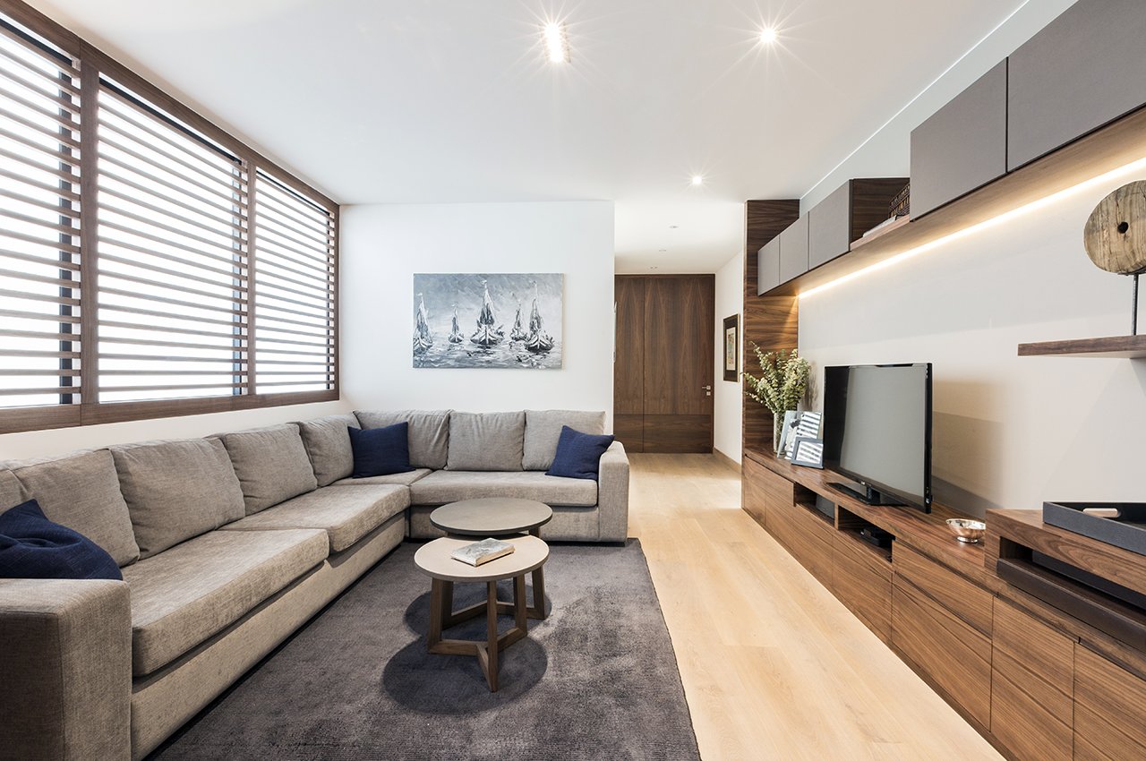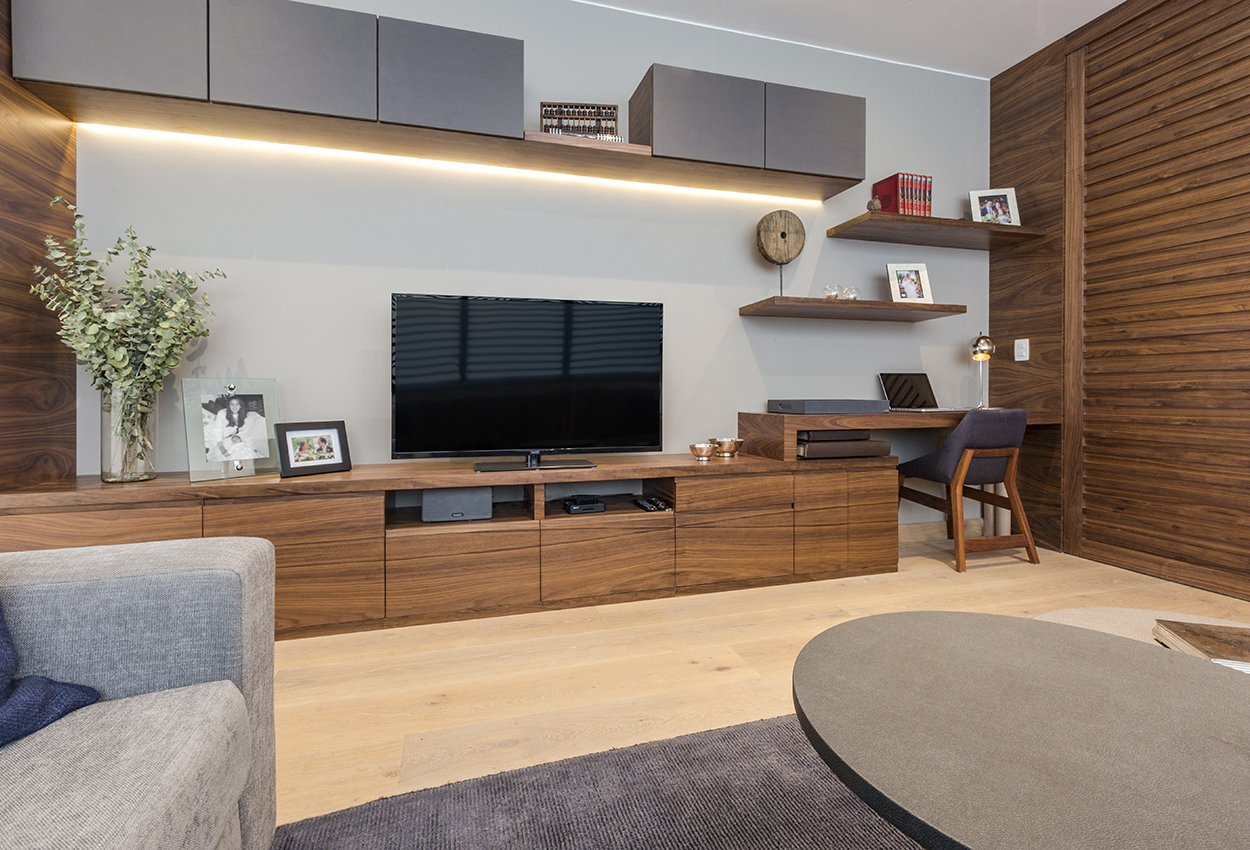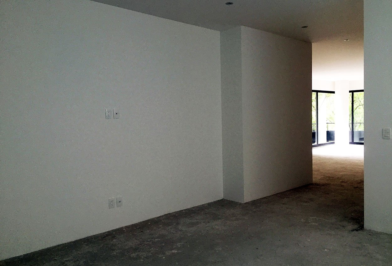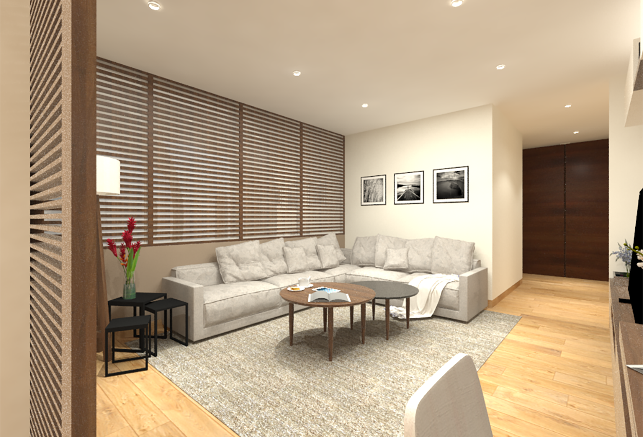 Primero definimos el material que utilizaríamos en el piso, madera de ingeniería en tono claro para que tuviera un buen contraste con las puertas existentes y futura carpintería fija de tono nogal. Después definimos el layout en el espacio el tamaño del sofá, las mesas de centro, laterales y la lámpara de pie. Diseñamos una puerta corrediza para separar pasillo de entrada de sala de tv. Del lado de la sala de tele con fondo de madera y del lado del pasillo con fondo de espejo para darle profundidad al espacio.