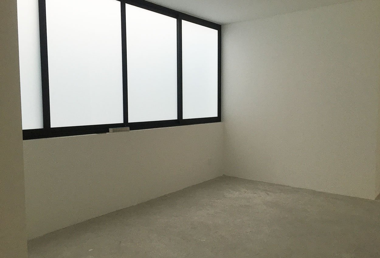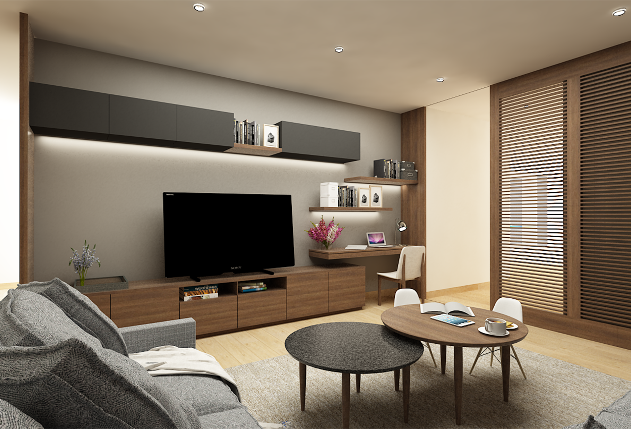 También diseñamos un mueble de tele a la medida con un escritorio integrado donde pudieran trabajar y para tapar las ventanas diseñamos unos louvers de madera que permitían en paso de luz al espacio, pero le daban un toque mucho más estético a las ventanas.