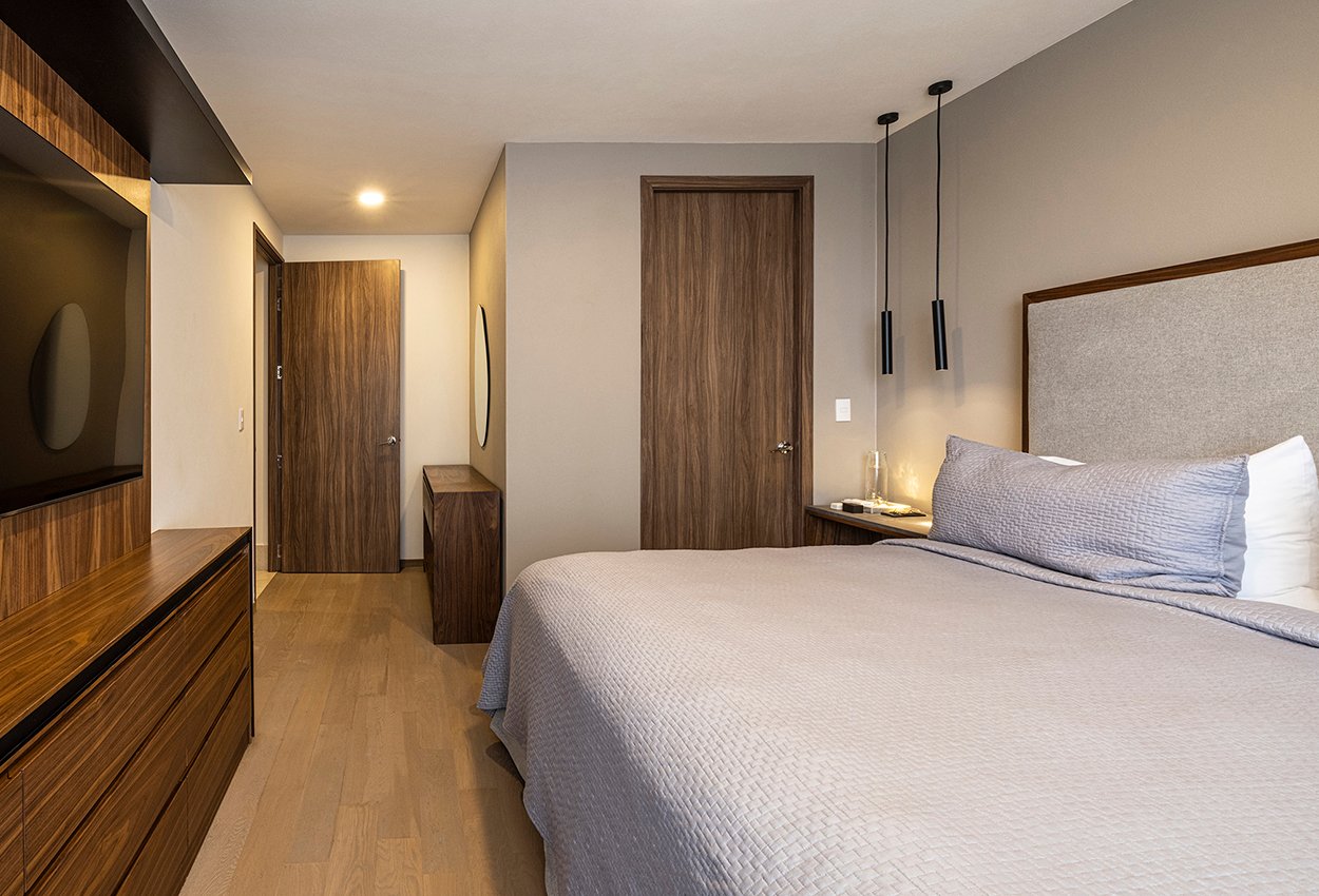 Además del mueble a la medida, añadimos una puerta de cristal y herrería que se oculta en la parte posterior de este mueble y separa áreas públicas (sala, comedor y cocina) de áreas privadas (baños y recámaras).