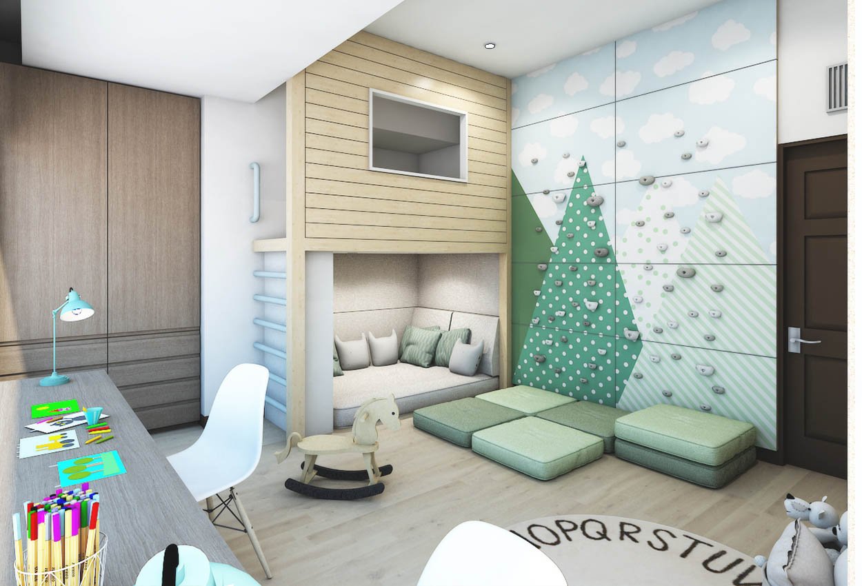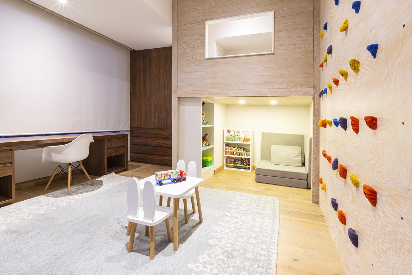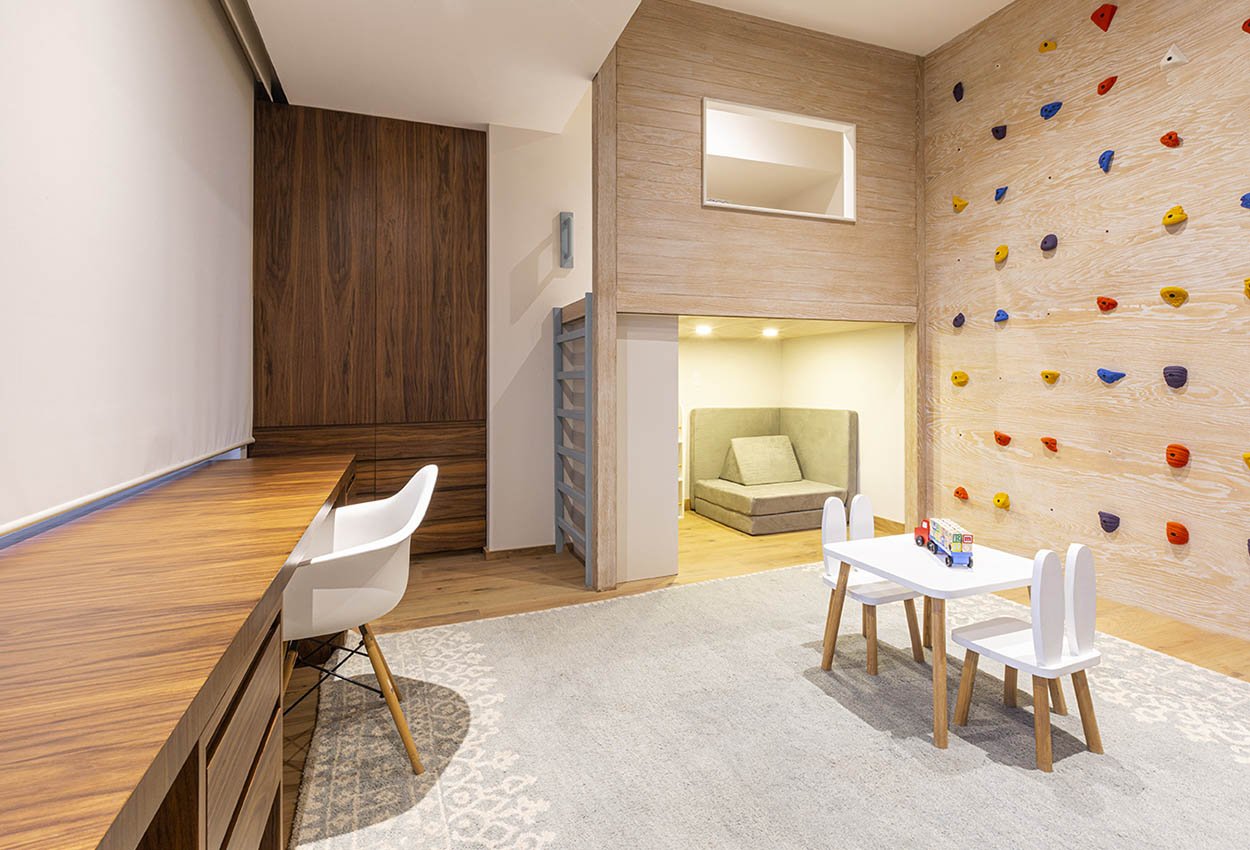 Aprovechamos los nichos existentes en el espacio para diseñar un closet y una casita de juegos con un área de lectura en la parte inferior. En el muro integramos un muro de escalar y propusimos un par de colchonetas apilables para evitar que se lastimen.