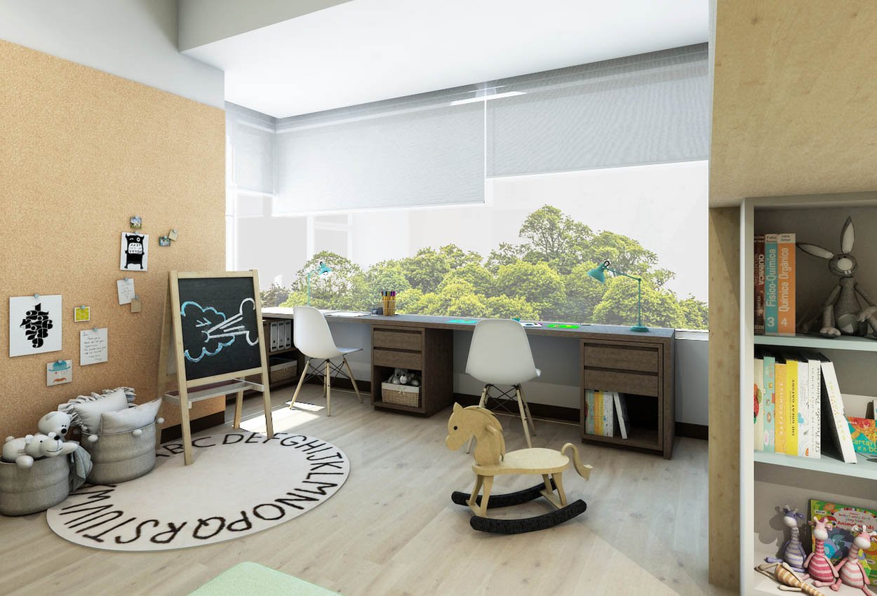 Frente a la ventana diseñamos un escritorio para 2 personas donde puedan realizar sus tareas cuando crezcan.
