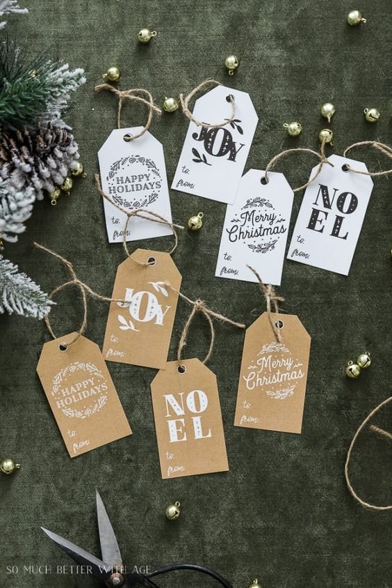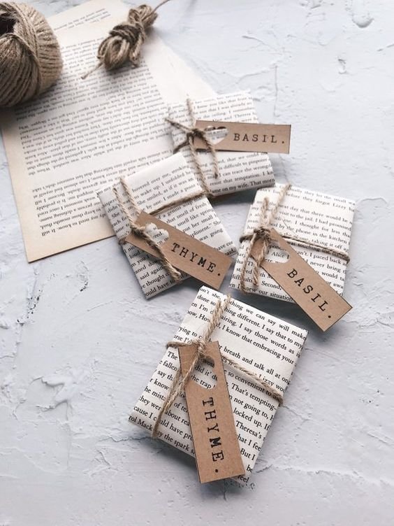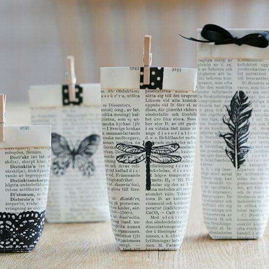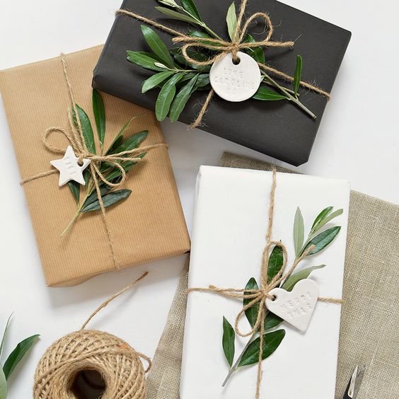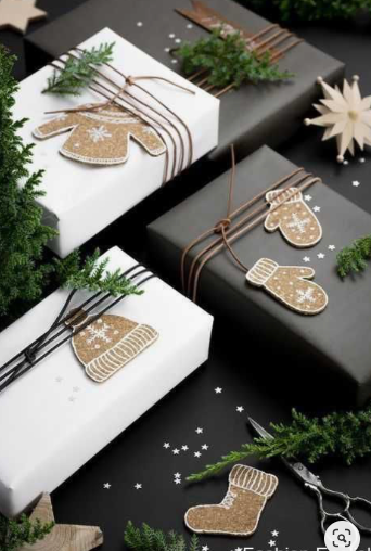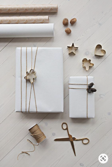 Usa todo lo que tengas en tu casa, ramas, palitos de canela, cachos de papel de otros años, listones, sellos, moldes de galletas, etc … para hacer de cada envoltura algo único.