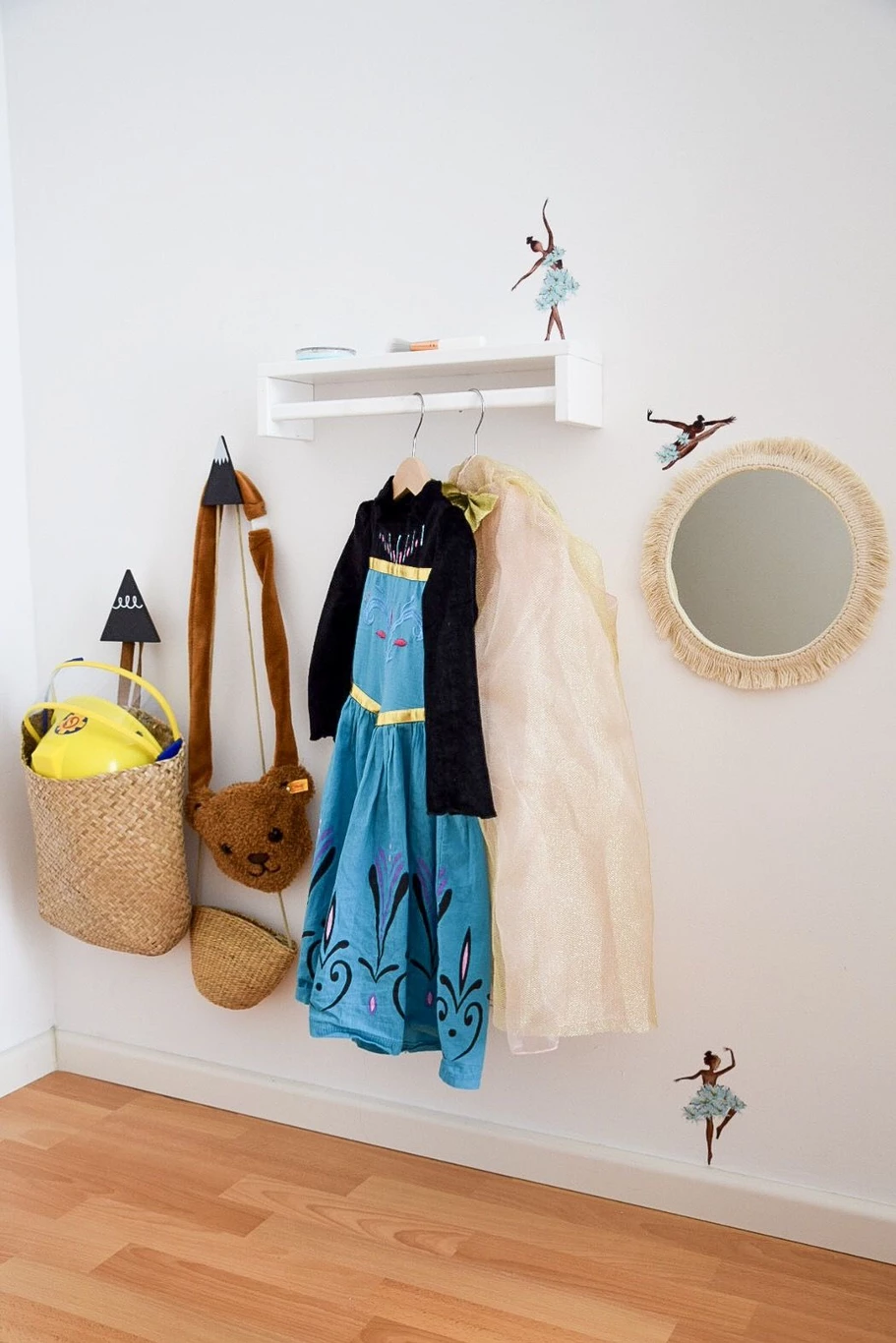No se necesita mucho, con unos estantes para que organicen sus disfraces, un espejo, un pequeño escenario hecho de tarimas de madera y un par de cortinas, ellos sacaran el artista que llevan dentro.