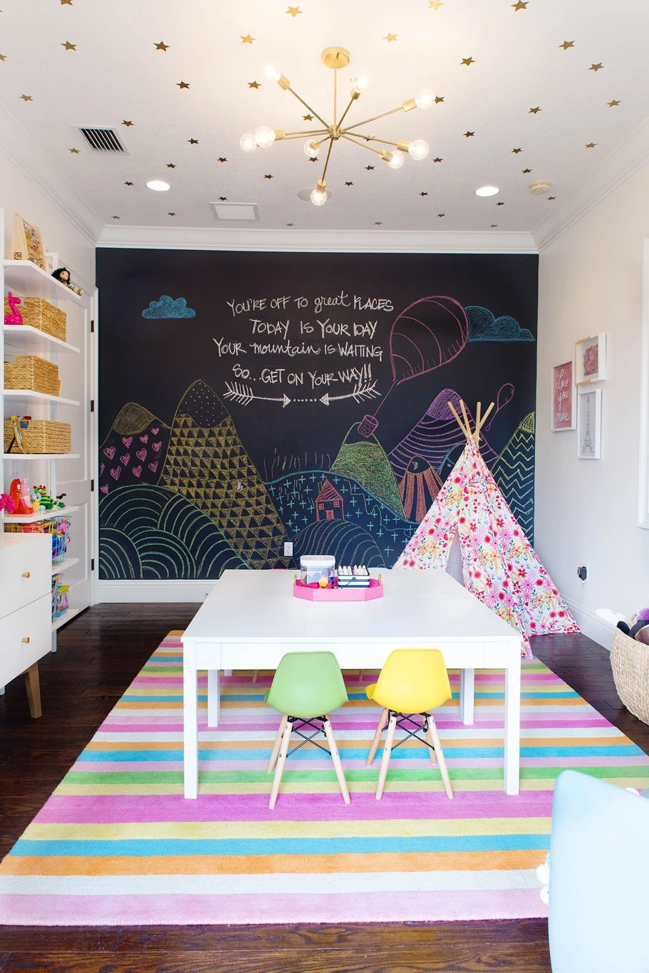 Un muro con pintura para pizarrón, rollos de papel o una pizarra, ayudaran a explotar su creatividad y mantener a limpios los demás muros.