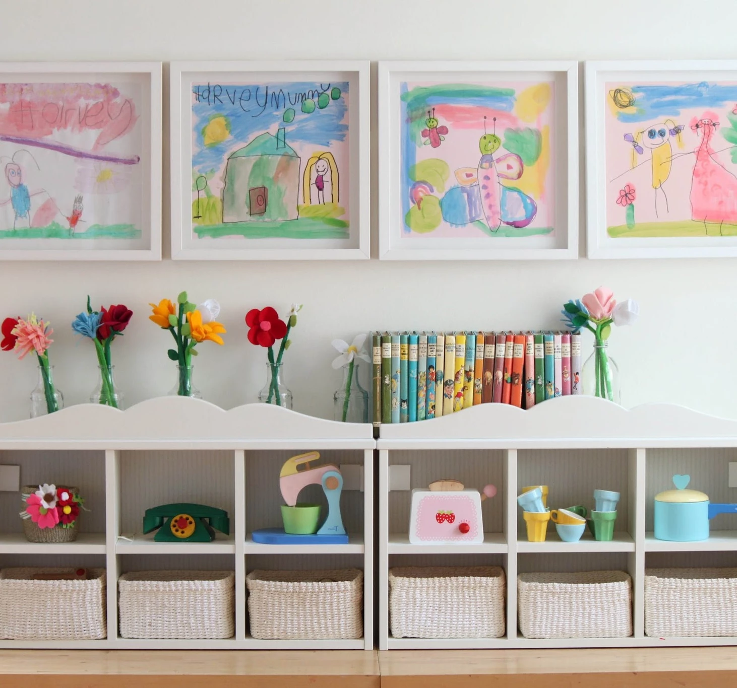 Utilizar los dibujos y manualidades como decoración es una manera muy linda de animarlos a que sigan creando, además dará a la habitación un toque muy divertido y relajado.