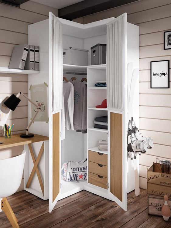 Utiliza las esquinas: Las esquinas en los closets pequeños son vitales, los muebles esquineros, aunque son pequeños, te permitirán almacenar y mantener ordenados más objetos y accesorios.
